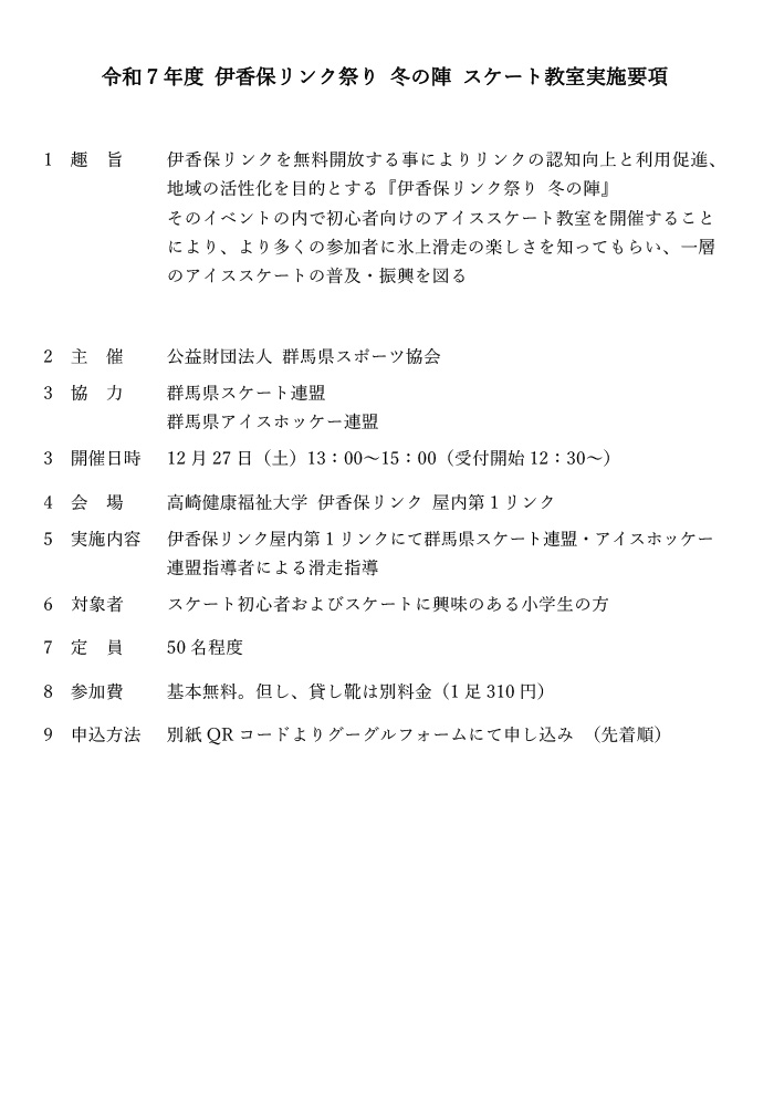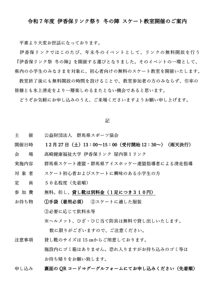 令和7年度 伊香保リンク祭り 無料開放 スケート教室の開催について