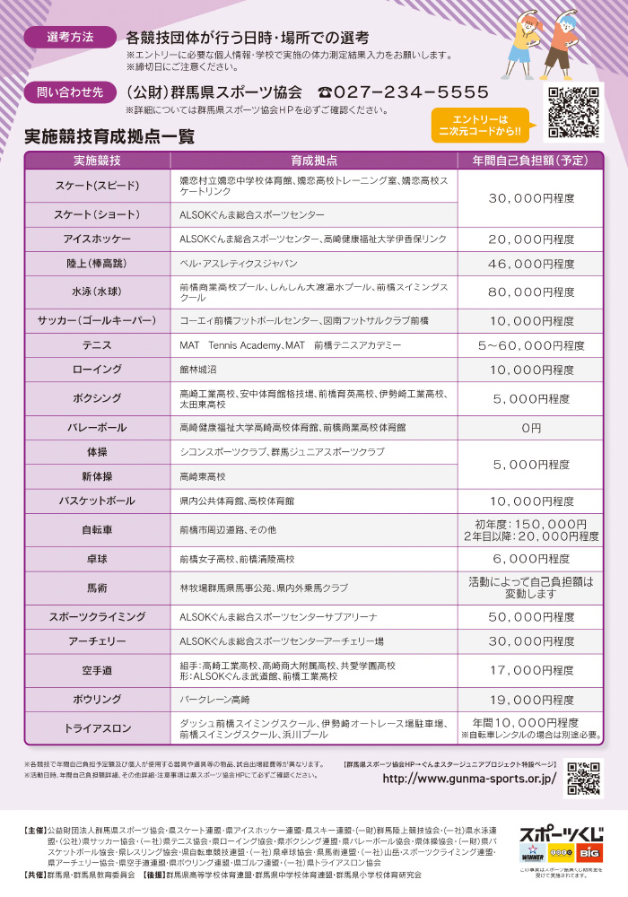 | 実施競技 | 育成拠点・日時 | 年間自己負担額 |